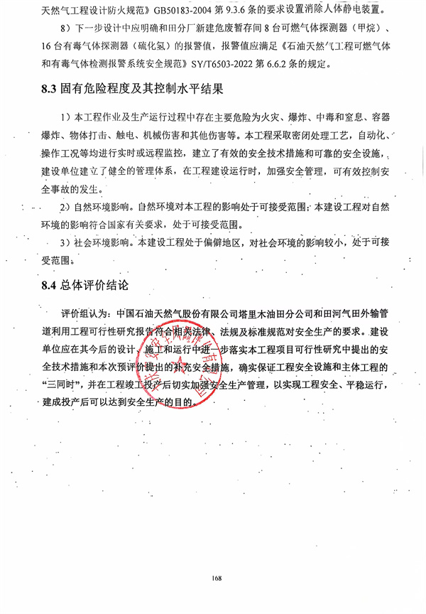 中國石油天然氣股份有限公司塔里木油田分公司和田河氣田外輸管道利用工程可行性研究報告符合相關(guān)法律、法規(guī)及標(biāo)準(zhǔn)規(guī)范對安全生產(chǎn)的要求。建設(shè)單位應(yīng)在其今后的設(shè)計、施工和運行中進(jìn)一步落實本工程項目可行性研究中提出的安全技術(shù)措施和本次預(yù)評價提出的補(bǔ)充安全措施,確實保證工程安全設(shè)施和主體工程的“三同時”,并在工程竣工投產(chǎn)后切實加強(qiáng)安全生產(chǎn)管理,以實現(xiàn)工程安全、平穩(wěn)運行,建成投產(chǎn)后可以達(dá)到安全生產(chǎn)的目的。 |