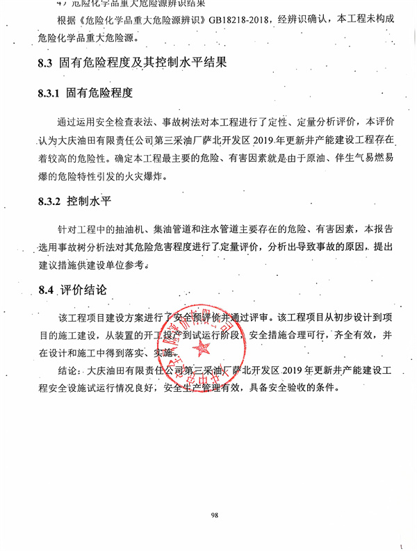 大慶油田有限責任公司第三采油廠薩北開發(fā)區(qū)2019年更新井產(chǎn)能建設(shè)工程安全驗收評價報告