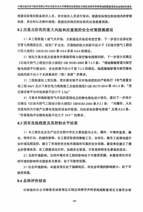 吐哈油田分公司鄯善采油管理區(qū)石錢區(qū)塊探評井轉(zhuǎn)采地面配套項目方案符合相關(guān)法律、法規(guī)及標準規(guī)范對安全生產(chǎn)的要求。建設(shè)單位應(yīng)在其今后的設(shè)計、施工和運行中進一步落實本工程方案提出的安全技術(shù)措施和本次預(yù)評價提出的補充安全措施,確實保證工程安全設(shè)施和主體工程的“三同時”,并在工程竣工投產(chǎn)后切實加強安全生產(chǎn)管理,以實現(xiàn)工程安全、平穩(wěn)運行,本項目危險有害因素能夠得到控制,建成投產(chǎn)后,能達到有關(guān)法律、法規(guī)及標準規(guī)定的安全要求。 |