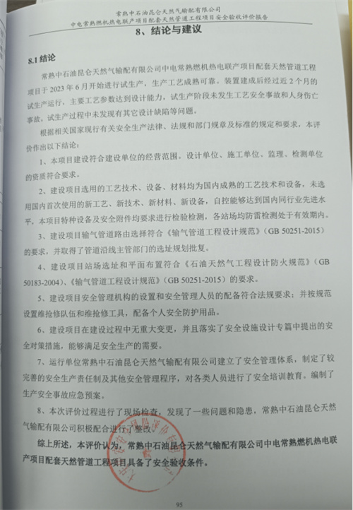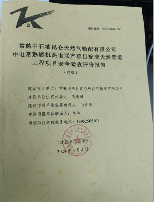 常熟中石油昆侖天然氣輸配有限公司中電常熟燃機熱電聯(lián)產(chǎn)項目配套天然管道工程項目安全設(shè)施竣工驗收評價報告 |