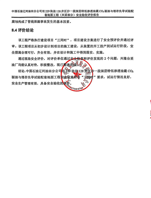 中國石油遼河油田分公司雙229塊洼128井區(qū)沙一段深層特低滲透油藏CO2驅(qū)油與埋存先導(dǎo)試驗配套地面工程(興采部分)安全驗收評價報告 |
