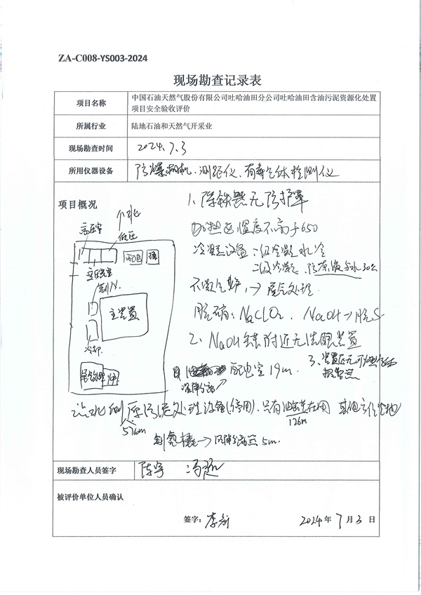 本工程內(nèi)容為新建含油污泥處理站1座以及相關(guān)配套配套設(shè)施,本項目沒有采用國家明令淘汰、禁止使用和危及安全生產(chǎn)的設(shè)備和工藝,項目嚴(yán)格執(zhí)行建設(shè)項目“三同時”,對項目進(jìn)行了安全預(yù)評價并通過評審。本工程項目從初步設(shè)計到項目的施工建設(shè),從裝置的開工投產(chǎn)到試運行,安全措施合理可行,齊全有效,并在設(shè)計和施工中得到落實、實施。 綜上所述,評價單位認(rèn)為:中國石油天然氣股份有限公司吐哈油田分公司吐哈油田含油污泥資源化處置項目設(shè)計、施工、試運行管理和監(jiān)督制度齊全,安全設(shè)施與主體工程同時設(shè)計、同時施工、同時投入生產(chǎn)和使用,經(jīng)過符合性檢查,符合法律、法規(guī)和標(biāo)準(zhǔn)規(guī)范的要求。評價組對現(xiàn)場進(jìn)行勘察,共發(fā)現(xiàn)2處安全隱患,鄯善采油管理區(qū)已對隱患進(jìn)行整改,該工程試運行情況良好,安全生產(chǎn)管理有效,該工程具備安全驗收的條件。 |