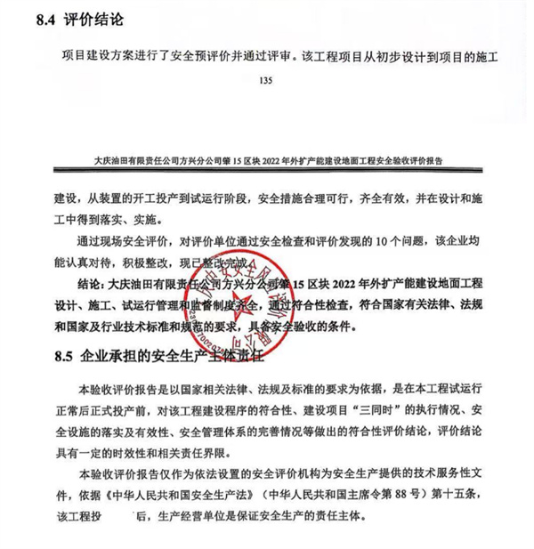 大慶油田有限責任公司方興分公司肇15區(qū)塊2022年外擴產(chǎn)能建設(shè)地面工程設(shè)計、施工、試運行管理和監(jiān)督制度齊全,通過符合性檢查,符合國家有關(guān)法律、法規(guī)和國家及行業(yè)技術(shù)標準和規(guī)范的要求,具備安全驗收的條件。