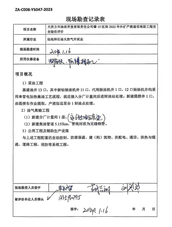 大慶油田有限責任公司方興分公司肇15區(qū)塊2022年外擴產(chǎn)能建設(shè)地面工程安全驗收評價