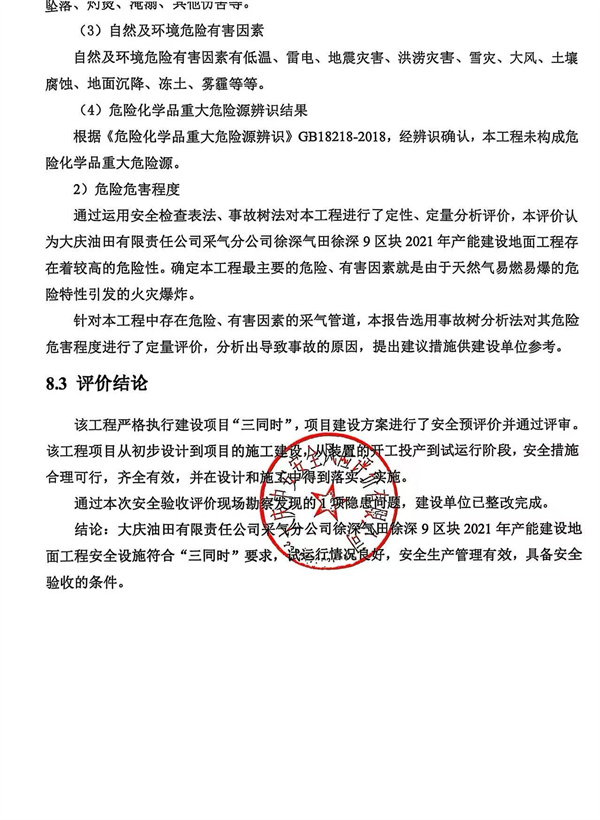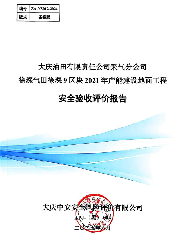 大慶油田有限責(zé)任公司采氣分公司徐深氣田徐深9區(qū)塊2021年產(chǎn)能建設(shè)地面工程安全驗收評價