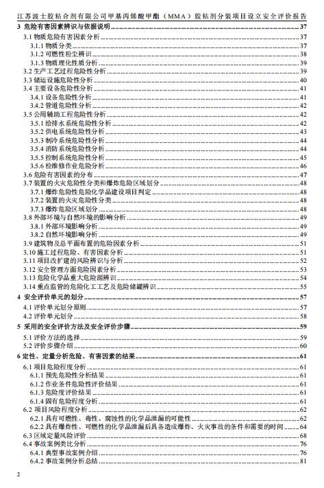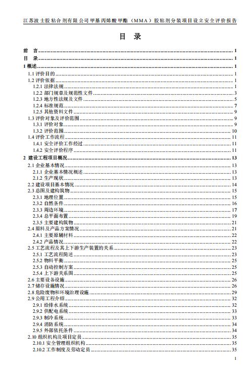 江蘇波士膠粘合劑有限公司甲基丙烯酸甲酯(MMA)膠粘劑分裝項目 設立安全評價報告