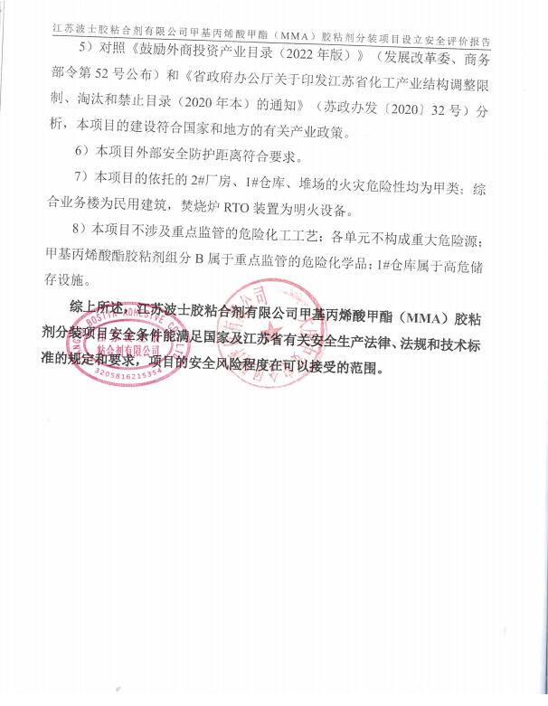 江蘇波士膠粘合劑有限公司甲基丙烯酸甲酯(MMA)膠粘劑分裝項目安全條件能滿足國家及江蘇省有關安全生產法律、法規(guī)和技術標準的規(guī)定和要求,項目的安全風險程度在可以接受的范圍。 |