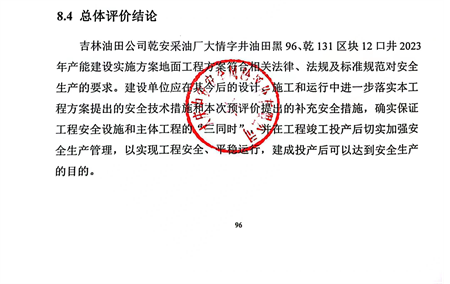 吉林油田公司乾安采油廠大情字井油田黑96、乾131區(qū)塊12口井2023年產(chǎn)能建設(shè)實(shí)施方案地面工程方案符合相關(guān)法律、法規(guī)及標(biāo)準(zhǔn)規(guī)范對安全生產(chǎn)的要求。建設(shè)單位應(yīng)在其今后的設(shè)計(jì)、施工和運(yùn)行中進(jìn)一步落實(shí)本工程方案提出的安全技術(shù)措施和本次預(yù)評(píng)價(jià)提出的補(bǔ)充安全措施,確實(shí)保證工程安全設(shè)施和主體工程的“三同時(shí)”,并在工程竣工投產(chǎn)后切實(shí)加強(qiáng)安全生產(chǎn)管理,以實(shí)現(xiàn)工程安全、平穩(wěn)運(yùn)行,建成投產(chǎn)后可以達(dá)到安全生產(chǎn)的目的。 |