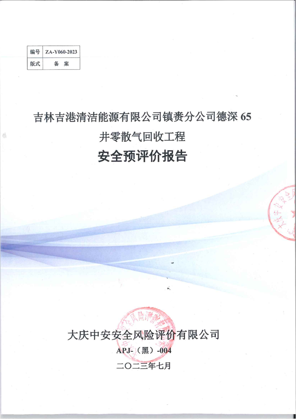 吉林吉港清潔能源有限公司鎮(zhèn)賚分公司德深65井零散氣回收工程安全預評價報告