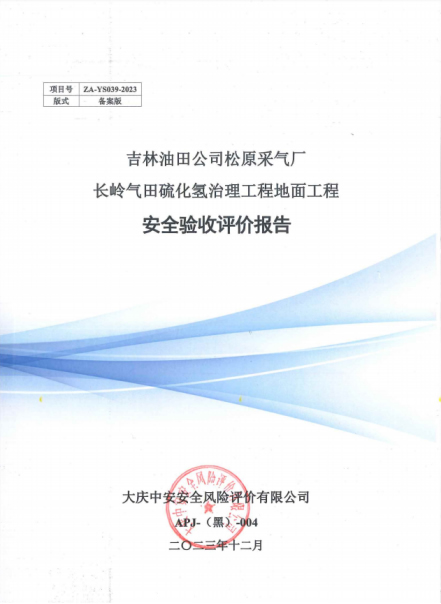 吉林油田公司松原采氣廠長(zhǎng)嶺氣田硫化氫治理工程地面工程安全驗(yàn)收評(píng)價(jià)報(bào)告