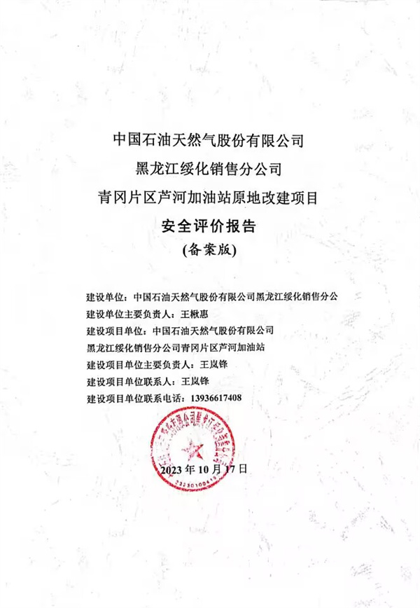 中國(guó)石油天然氣股份有限公司黑龍江綏化銷售分公司青岡片區(qū)蘆河加油站原地改建項(xiàng)目安全預(yù)評(píng)價(jià)