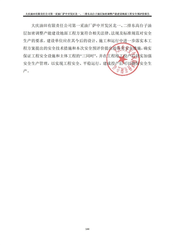 大慶油田有限責任公司第一采油廠薩中開發(fā)區(qū)北一、二排東高臺子油層加密調(diào)整產(chǎn)能建設地面工程方案符合相關法律、法規(guī)及標準規(guī)范對安全生產(chǎn)的要求。建設單位應在其今后的設計、施工和運行中進一步落實本工程方案提出的安全技術措施和本次安全預評價提出的補充安全措施,確實保證工程安全設施和主體工程的“三同時”,并在工程竣工投產(chǎn)后切實加強安全生產(chǎn)管理,以實現(xiàn)工程安全、平穩(wěn)運行,建成投產(chǎn)后可以確保安全生產(chǎn)。 |