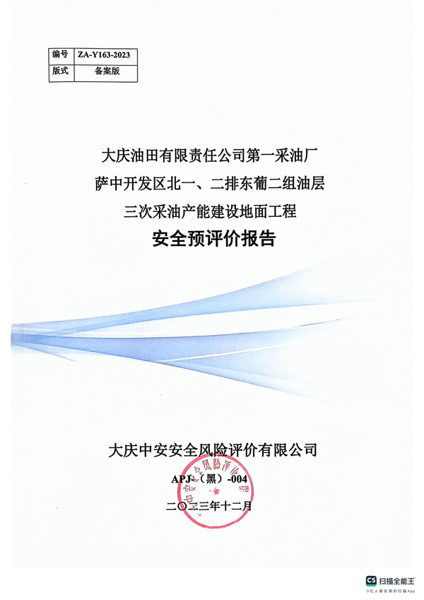 大慶油田有限責(zé)任公司第一采油廠薩中開發(fā)區(qū)北一、二排東葡二組油層三次采油產(chǎn)能建設(shè)地面工程安全預(yù)評價(jià)