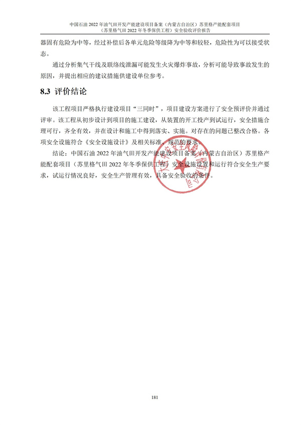 中國(guó)石油2022年油氣田開發(fā)產(chǎn)能建設(shè)項(xiàng)目備案(內(nèi)蒙古自治區(qū))蘇里格產(chǎn)能配套項(xiàng)目(蘇里格氣田2022年冬季保供工程)安全設(shè)施設(shè)置和運(yùn)行符合安全生產(chǎn)要求,試運(yùn)行情況良好,安全生產(chǎn)管理有效,具備安全驗(yàn)收的條件。 |
