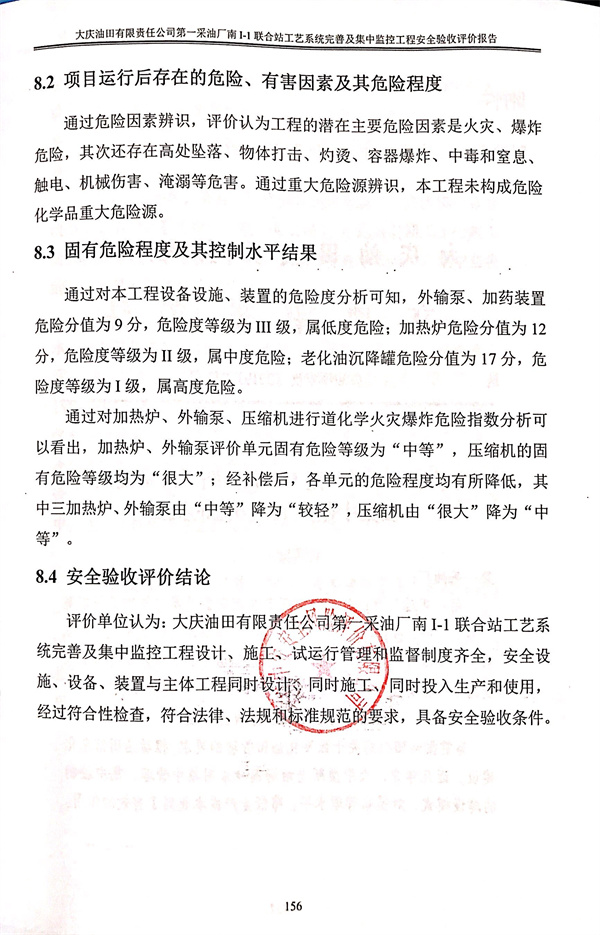 大慶油田有限責任公司第一采油廠南I-1聯(lián)合站工藝系統(tǒng)完善及集中監(jiān)控工程設(shè)計、施工、試運行管理和監(jiān)督制度齊全,安全設(shè)施、設(shè)備、裝置與主體工程同時設(shè)計、同時施工、同時投入生產(chǎn)和使用,經(jīng)過符合性檢查,符合法律、法規(guī)和標準規(guī)范的要求,具備安全驗收條件。 |