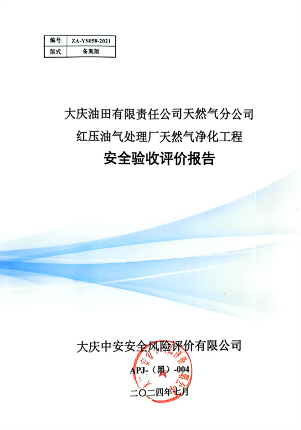 大慶油田有限責任公司天然氣分公司紅壓油氣處理廠天然氣凈化工程安全驗收評價報告