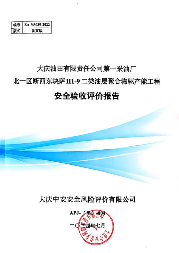 大慶油田有限責(zé)任公司第一采油廠北一區(qū)斷西東塊薩II1-9二類油層聚合物驅(qū)產(chǎn)能工程安全驗(yàn)收評(píng)價(jià)報(bào)告