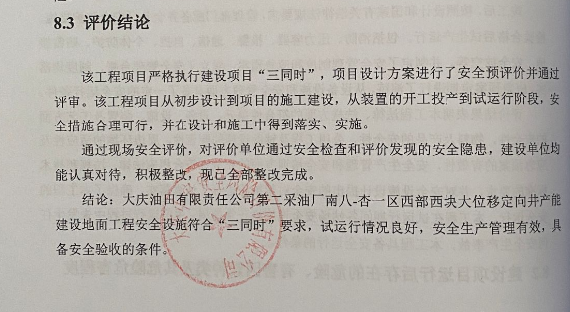 大慶油田有限責(zé)任公司第二采油廠南八-杏一區(qū)西部西塊大位移定向井產(chǎn)能建設(shè)地面工程安全設(shè)施符合“三同時(shí)”要求,試運(yùn)行情況良好,安全生產(chǎn)管理有效,具備安全驗(yàn)收的條件。