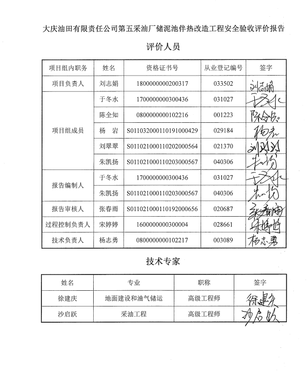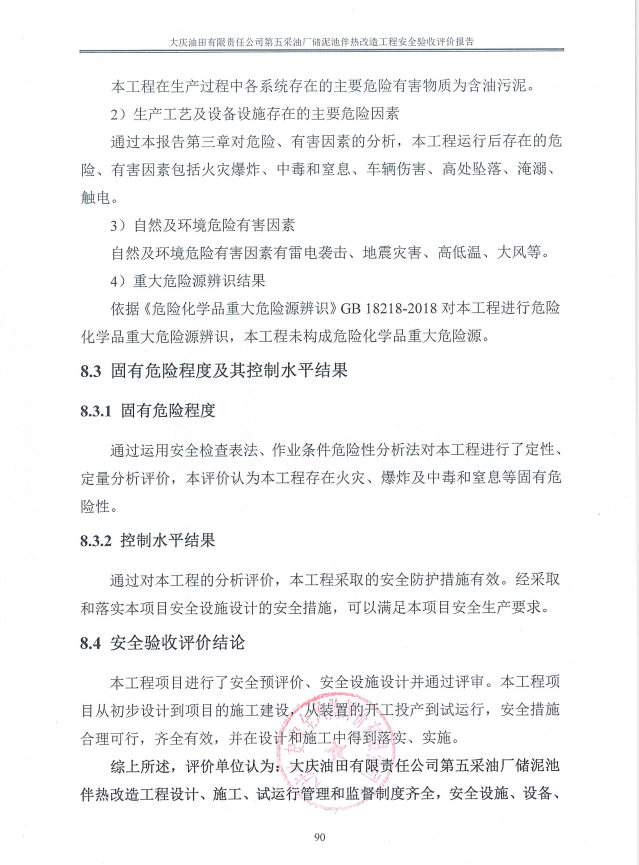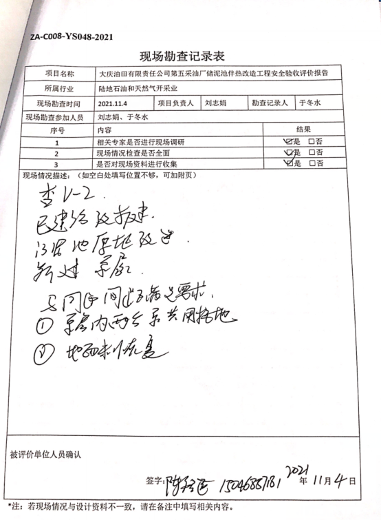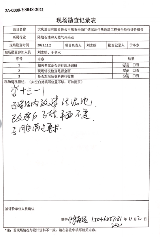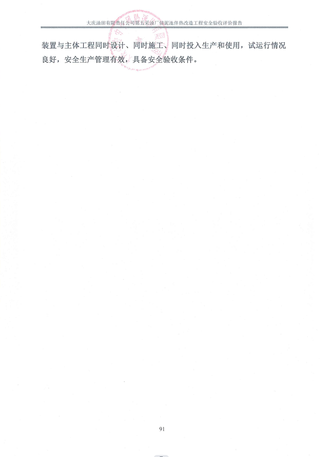 大慶油田有限責任公司第五采油廠儲泥池伴熱改造工程設(shè)計、施工、試運行管理和監(jiān)督制度齊全,安全設(shè)施、設(shè)備、裝置與主體工程同時設(shè)計、同時施工、同時投入生產(chǎn)和使用,試運行情況良好,安全生產(chǎn)管理有效,具備安全驗收條件。 |