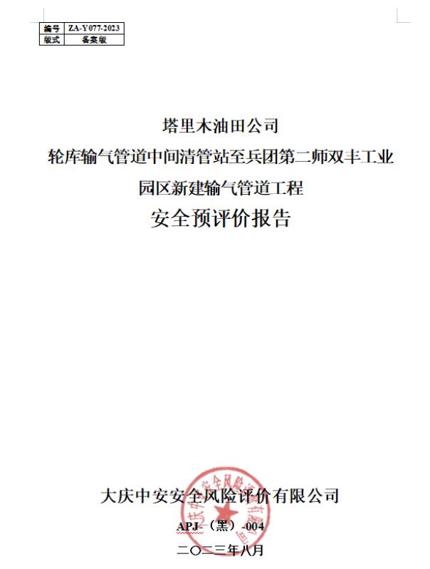 塔里木油田公司輪庫輸氣管道中間清管站至兵團第二師雙豐工業(yè)園區(qū)新建輸氣管道工程安全預(yù)評價報告
