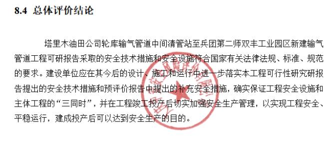 塔里木油田公司輪庫輸氣管道中間清管站至兵團第二師雙豐工業(yè)園區(qū)新建輸氣管道工程可研報告采取的安全技術(shù)措施和安全設(shè)施符合國家有關(guān)法律法規(guī)、標準、規(guī)范的要求。建設(shè)單位應(yīng)在其今后的設(shè)計、施工和運行中進一步落實本工程可行性研究研報告提出的安全技術(shù)措施和預(yù)評價報告中提出的補充安全措施,確實保證工程安全設(shè)施和主體工程的“三同時”,并在工程竣工投產(chǎn)后切實加強安全生產(chǎn)管理,以實現(xiàn)工程安全、平穩(wěn)運行,建成投產(chǎn)后可以達到安全生產(chǎn)的目的。 |