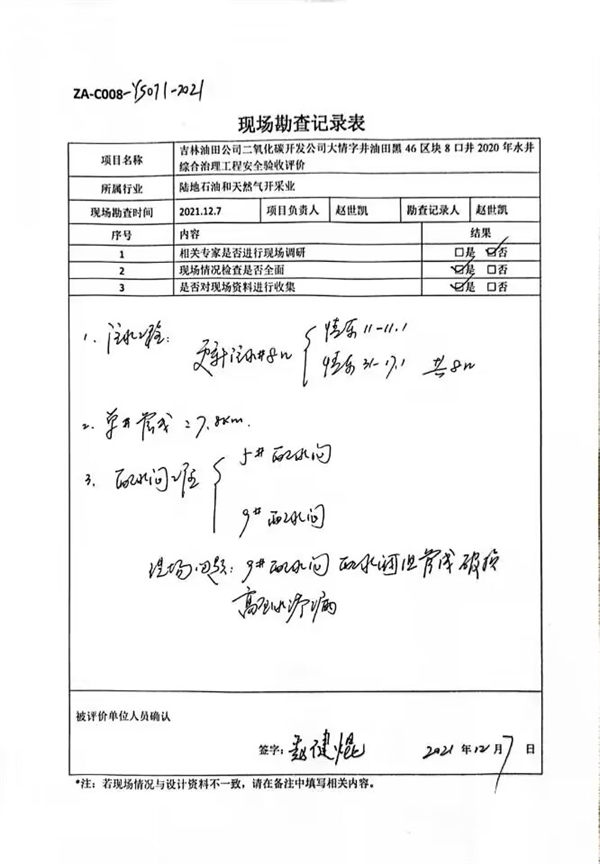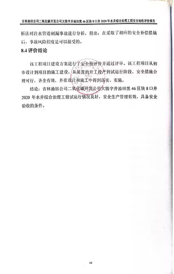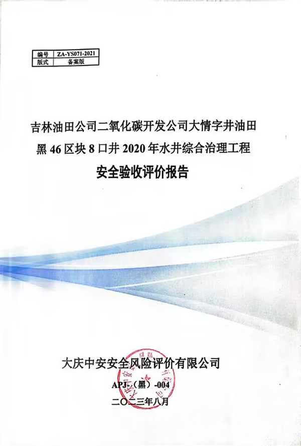吉林油田公司二氧化碳開發(fā)公司大情字井油田黑46區(qū)塊8口井2020年水井綜合治理工程 安全驗(yàn)收評價(jià)