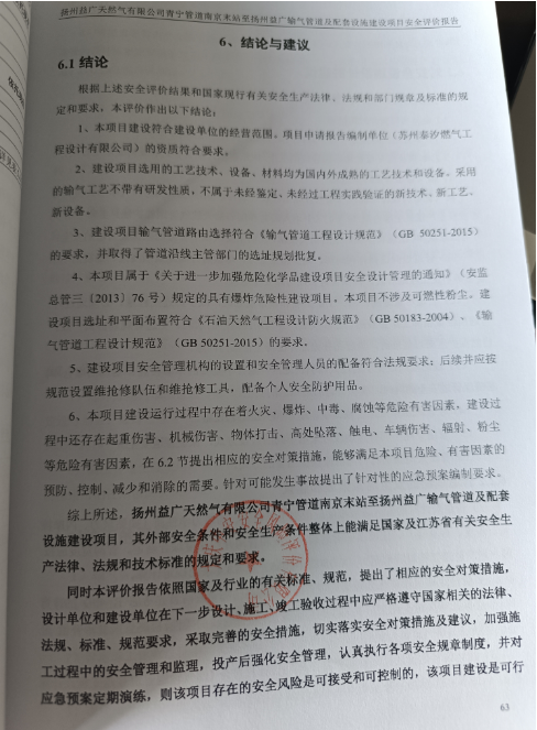 揚(yáng)州益廣天然氣有限公司青寧管道南京末站至揚(yáng)州益廣輸氣管道及配套設(shè)施建設(shè)項(xiàng)目,其外部安全條件和安全生產(chǎn)條件整體上能滿足國(guó)家及江蘇省有關(guān)安全生產(chǎn)法律、法規(guī)和技術(shù)標(biāo)準(zhǔn)的規(guī)定和要求 |